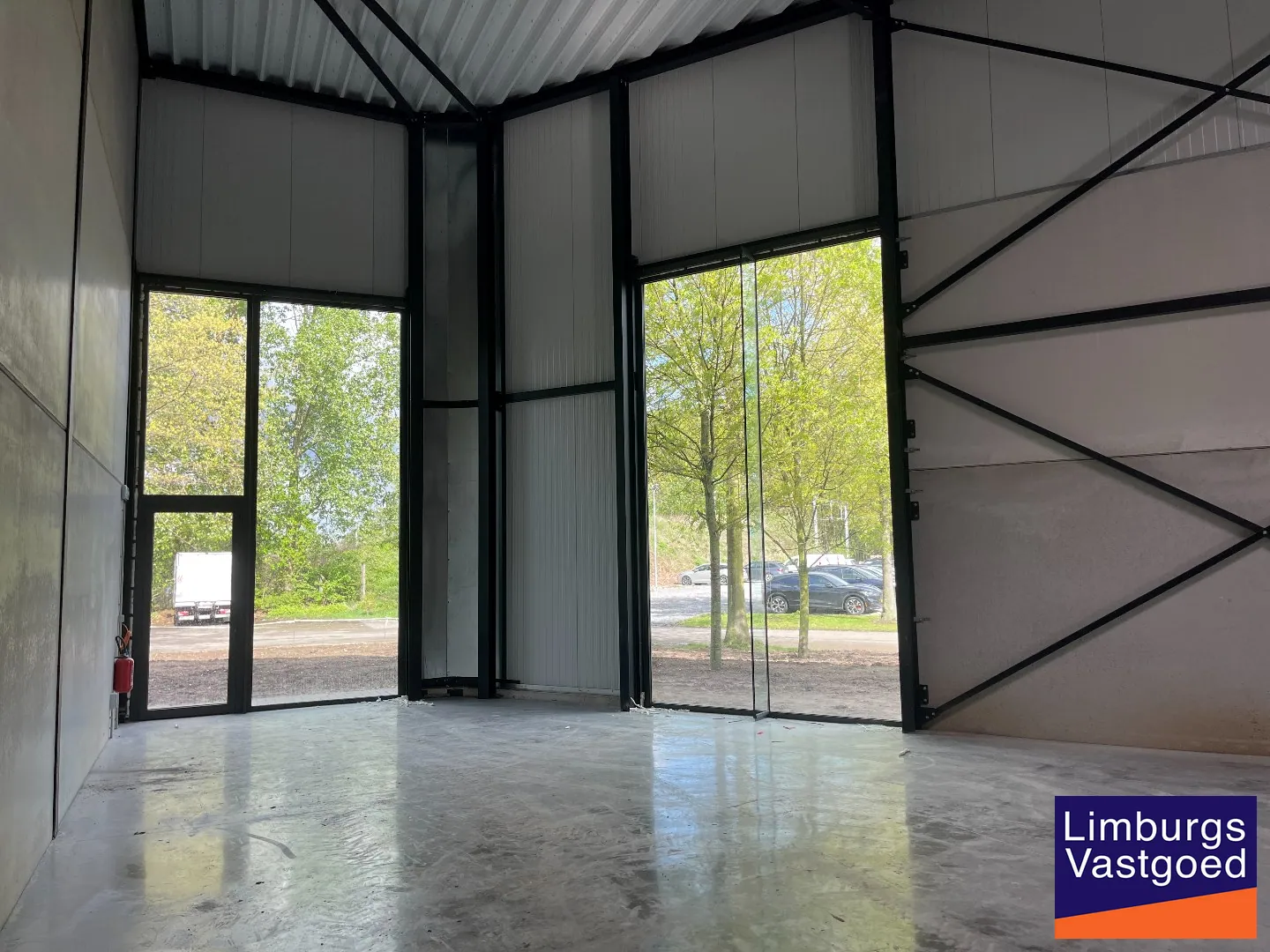 De hal is voorzien van sectionaalpoort (4m x 5m) en twee aparte toegangsdeuren, glaspartij voor natuurlijke lichtinval. Ruimte voorzien van moderne Ledverlichting.