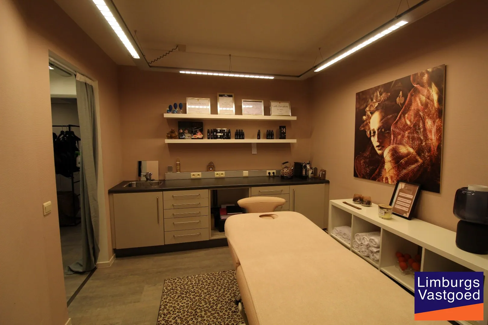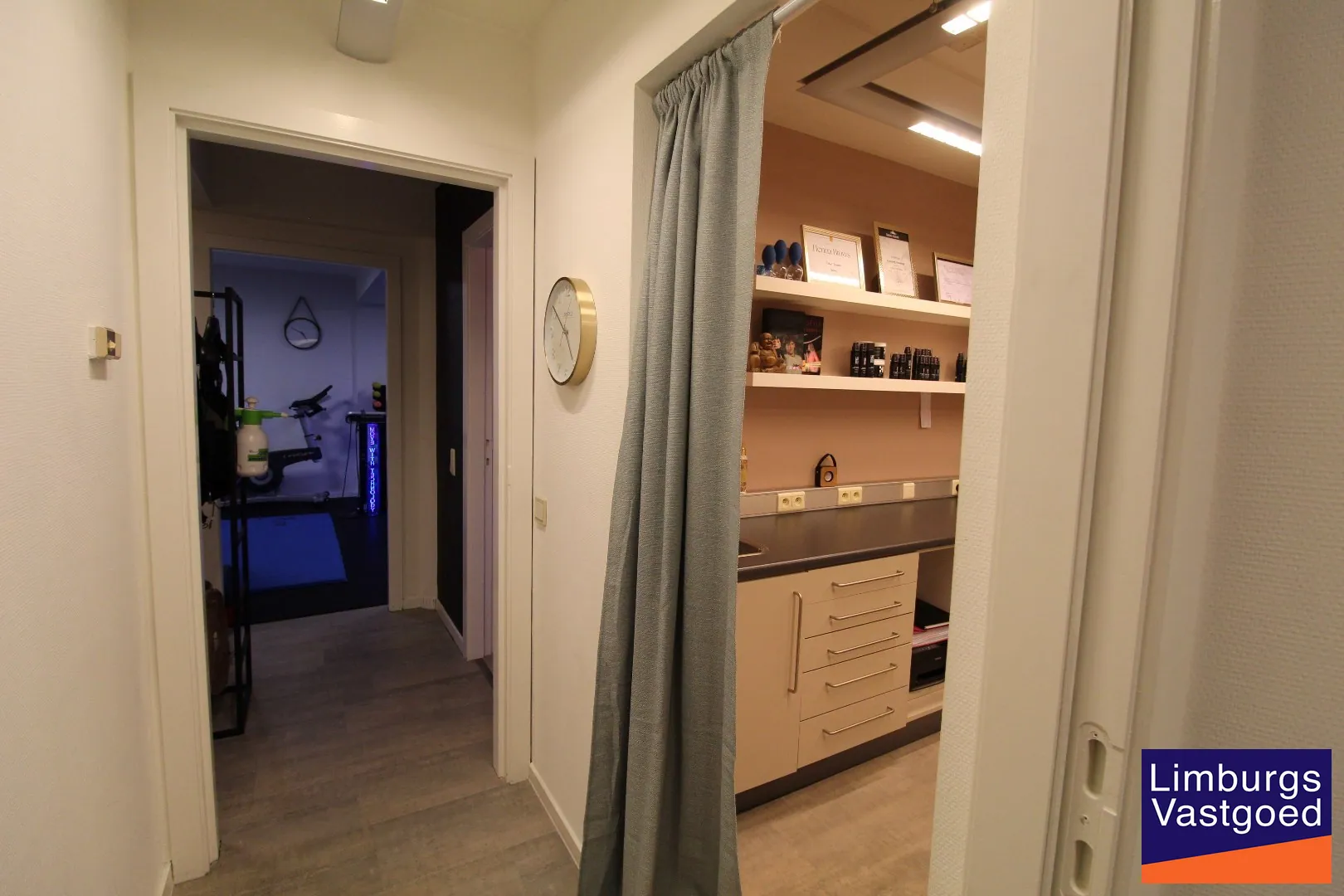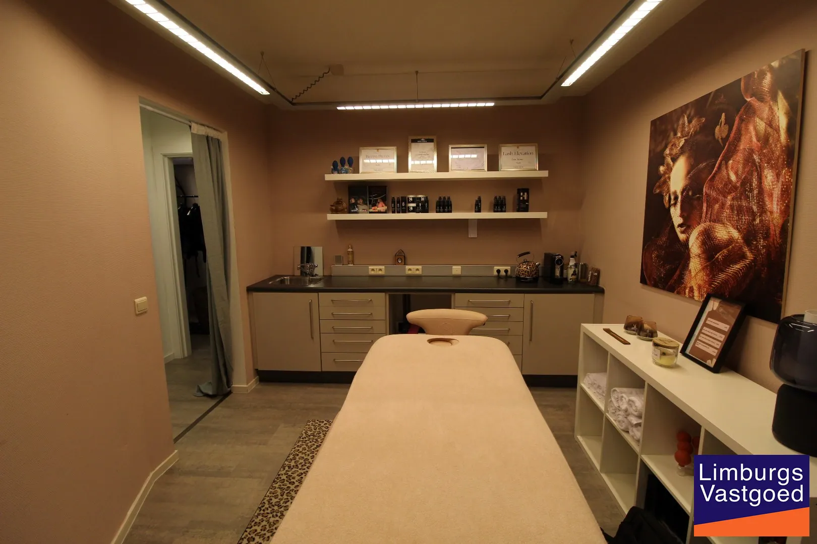 INDELING: Inkomhal met wachtzaal; Praktijkruimte met inbouwkasten en spoelbak; twee kleedkamers met toegang naar een behandelruimte/bureelruimte voorzien van inbouwkasten en sanitair; Berging.