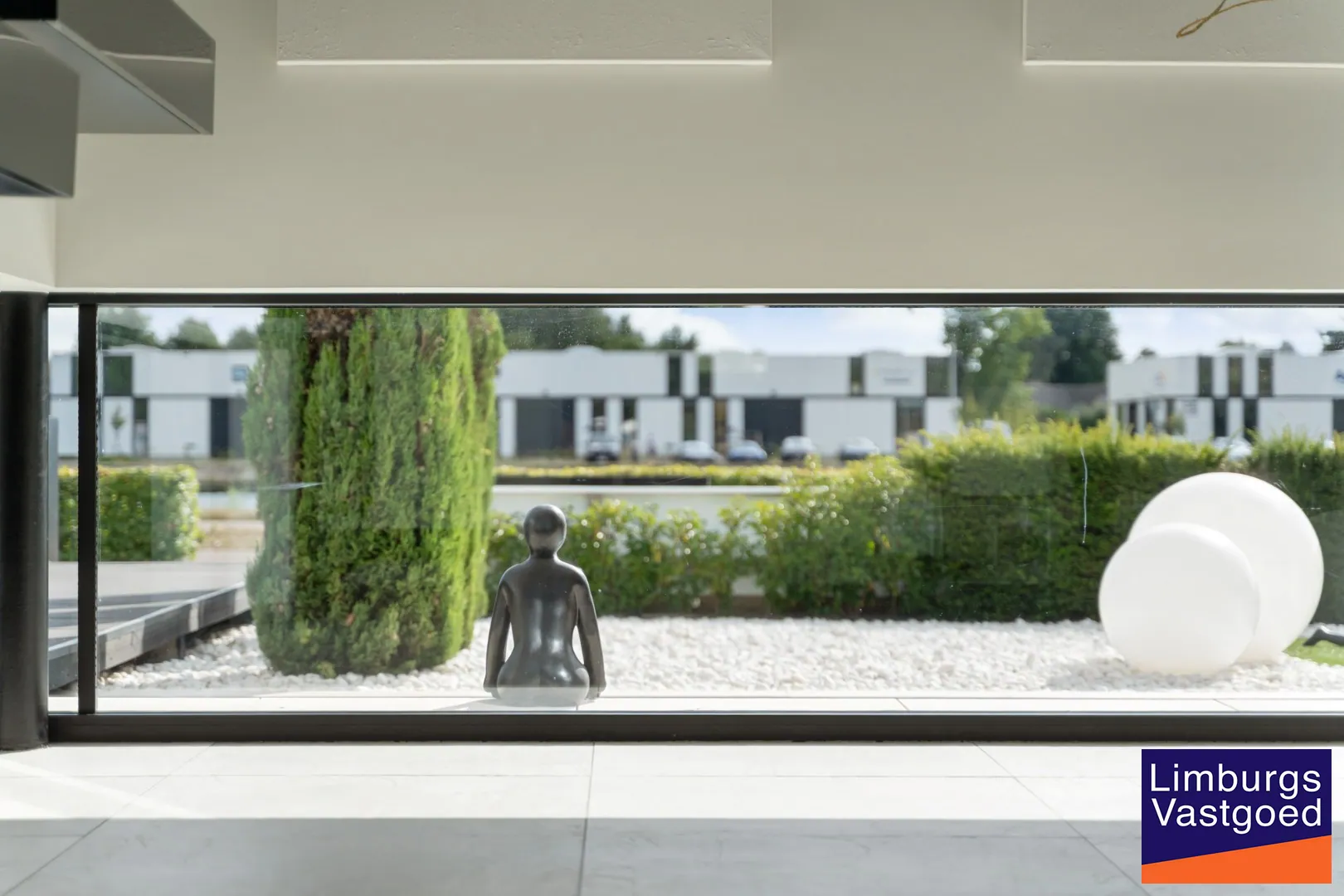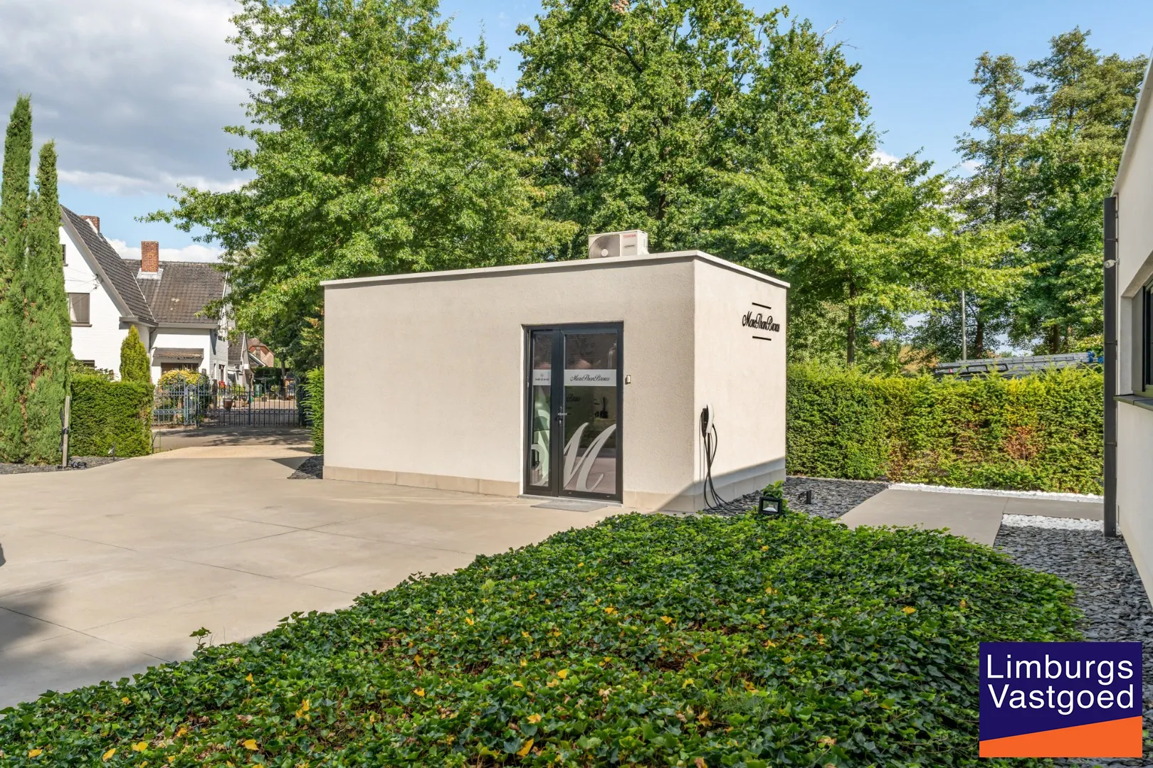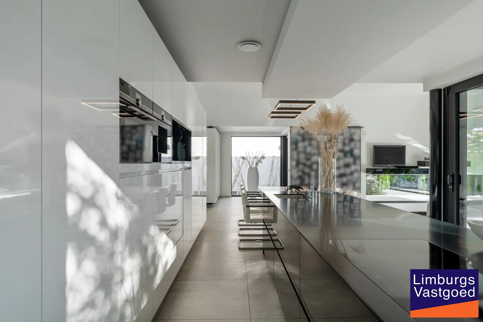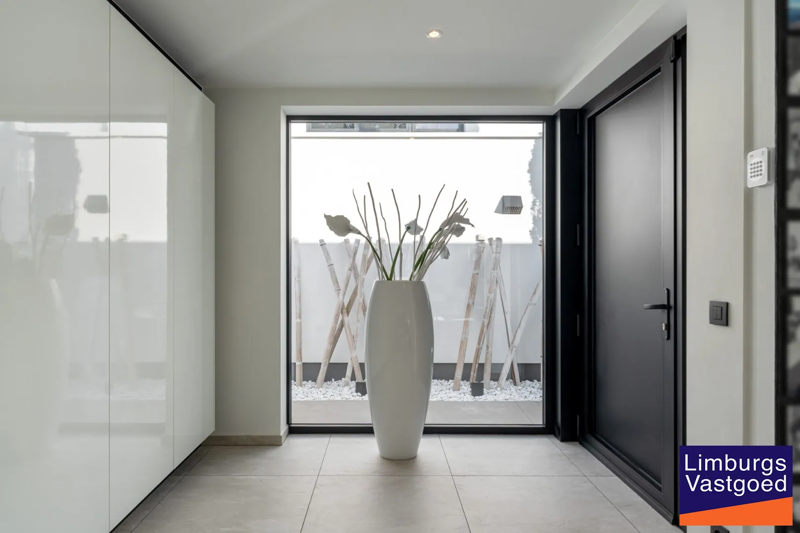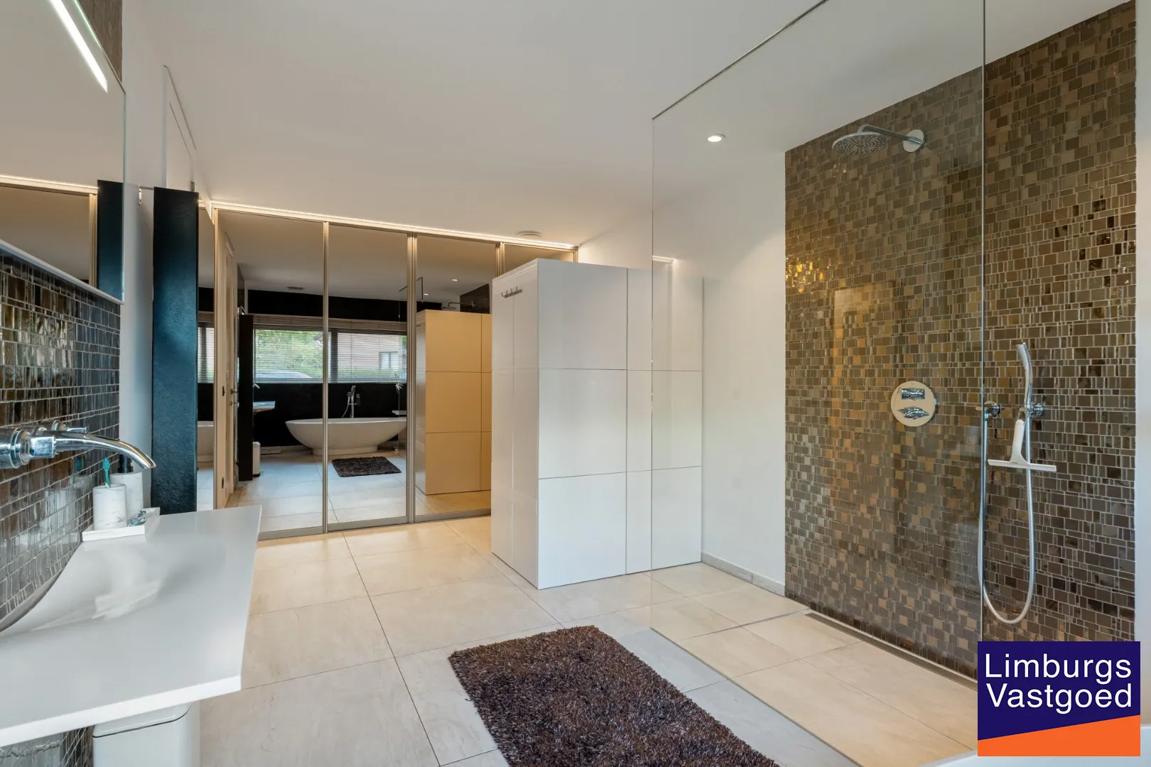 INDELING: Ruime inkomhal met apart toilet en inbouwkasten; Lichtrijke leefruimte met een open designkeuken voorzien van inbouwkasten, een werkblad en keukentafel in Corian en high-end toestellen (Siemens en Küppersbusch) waaronder een Quooker kraan en vaatwasser op manshoogte; De leefruimte met grote raampartijen loopt naadloos over in de onderhoudsvriendelijke buitenruimte ontworpen door Landschapsarchitect Willy Reynders. De buitenruimte is Zuid-georiënteerd en voorzien van een ruim overdekt terras van ong. 30m² afgewerkt met Carrera natuursteen en een zwembad met spectaculair uitzicht over het Albertkanaal. De villa beschikt over 3 slaapkamers waaronder een royale master bedroom met dressing; Elke slaapkamer is voorzien van inbouwkasten; Badkamer met inbouwkasten, een ligbad, ruime inloopdouche en lavabo. Volledig afgescheiden praktijkruimte (18m²) met apart toilet, hoogwaardig afgewerkt met natuurstenen vloer en airco (warmen/koelen). Beklinkerde parking.