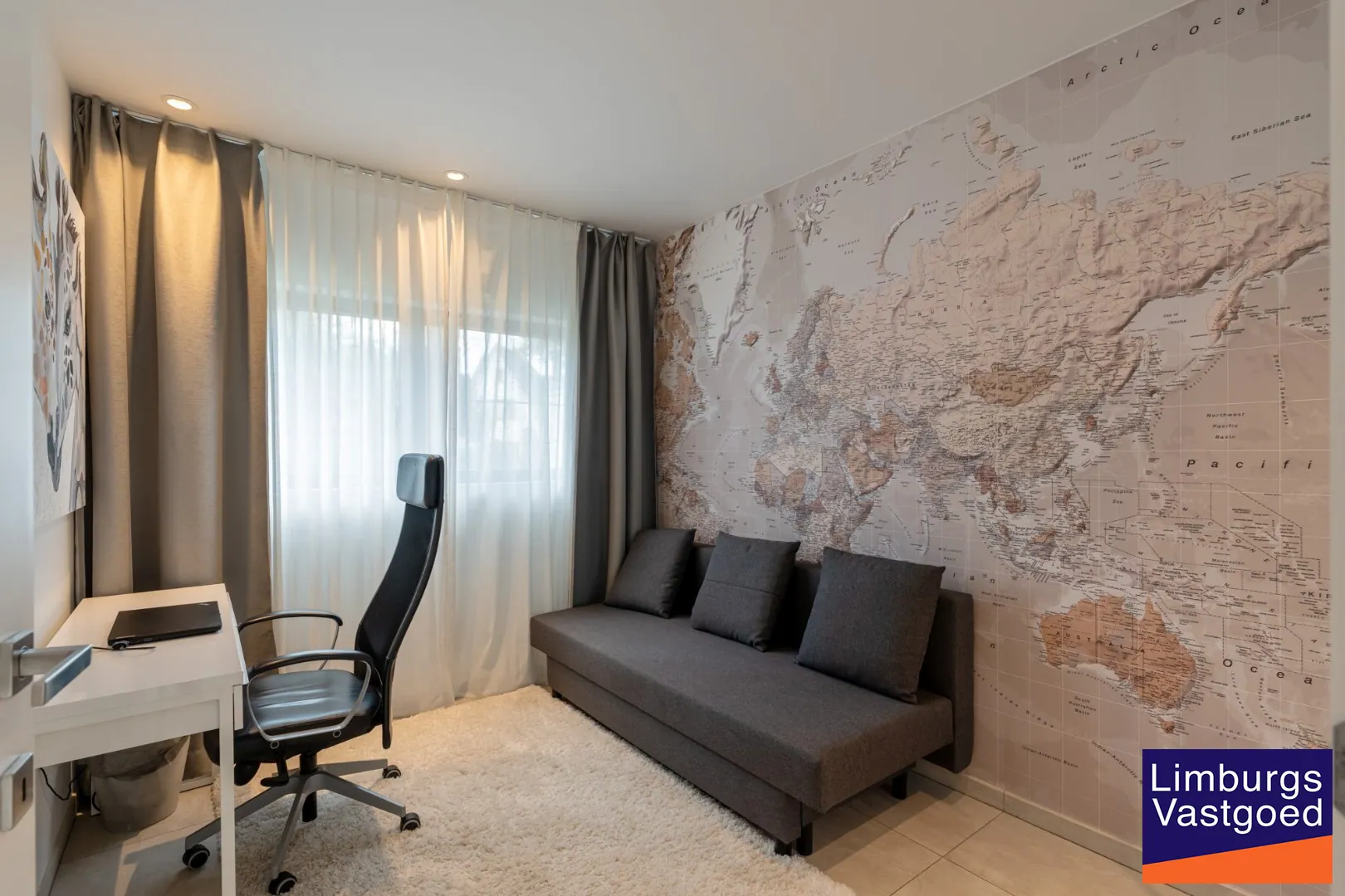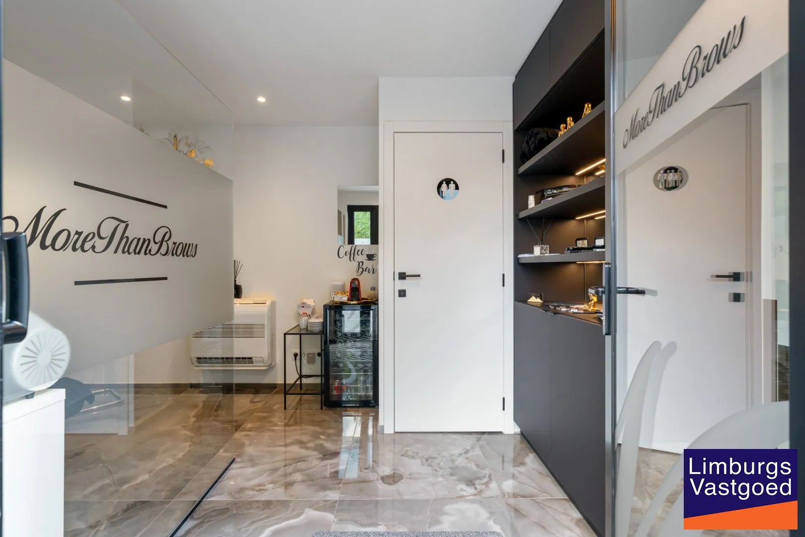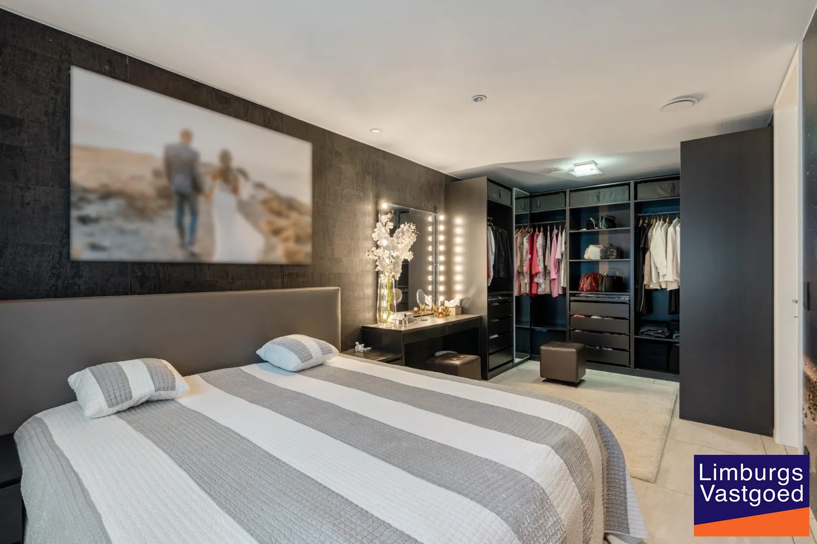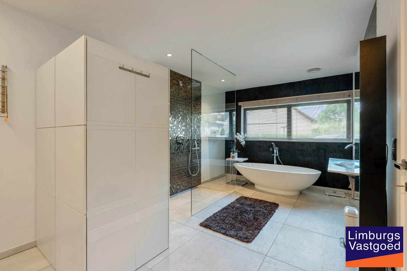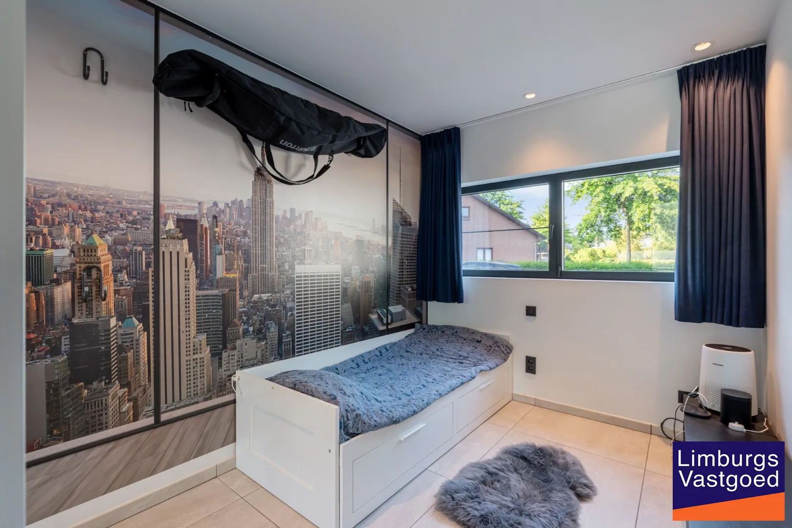 INDELING: Ruime inkomhal met apart toilet en inbouwkasten; Lichtrijke leefruimte met een open designkeuken voorzien van inbouwkasten, een werkblad en keukentafel in Corian en high-end toestellen (Siemens en Küppersbusch) waaronder een Quooker kraan en vaatwasser op manshoogte; De leefruimte met grote raampartijen loopt naadloos over in de onderhoudsvriendelijke buitenruimte ontworpen door Landschapsarchitect Willy Reynders. De buitenruimte is Zuid-georiënteerd en voorzien van een ruim overdekt terras van ong. 30m² afgewerkt met Carrera natuursteen en een zwembad met spectaculair uitzicht over het Albertkanaal. De villa beschikt over 3 slaapkamers waaronder een royale master bedroom met dressing; Elke slaapkamer is voorzien van inbouwkasten; Badkamer met inbouwkasten, een ligbad, ruime inloopdouche en lavabo. Volledig afgescheiden praktijkruimte (18m²) met apart toilet, hoogwaardig afgewerkt met natuurstenen vloer en airco (warmen/koelen). Beklinkerde parking.