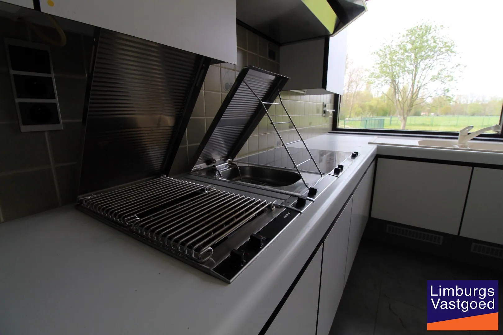 INDELING: GELIJKVLOERS: Ruime inkomhal met gastentoilet; Lichtrijke eet- en leefruimte voorzien van houtkachel en openhaard, met toegang tot de tuin; Keuken voorzien van elektrisch vuur, ingebouwde friteuse en gril, dampkap en frigo met diepvriesvak; Slaapkamer; Badkamer voorzien van douche, toilet en enkele lavabo; Inpandige garage met dubbele automatische poort; Berging met uitgietbak en aansluiting voor wasmachine. De keuken, eet- en woonkamer genieten van een prachtig zicht over de tuin, uitgestrekte velden en stallingen.