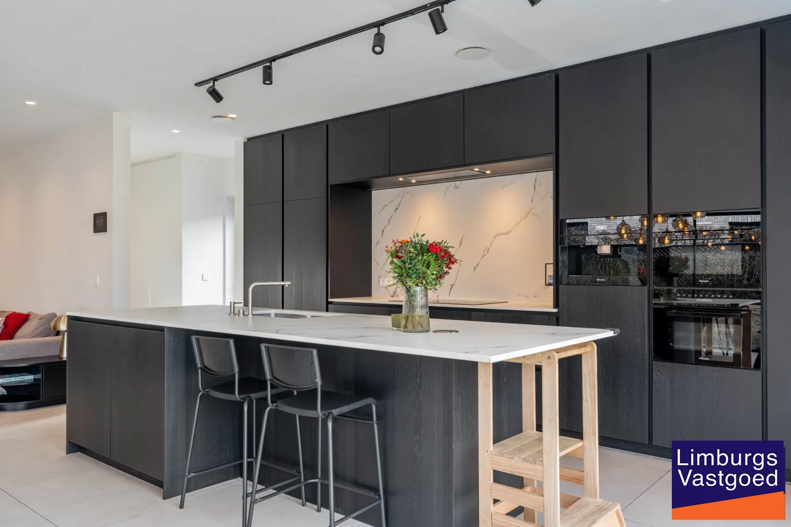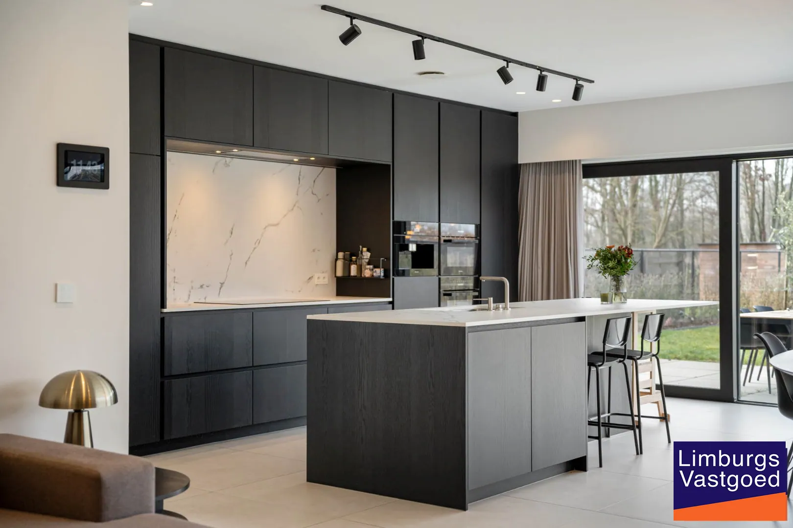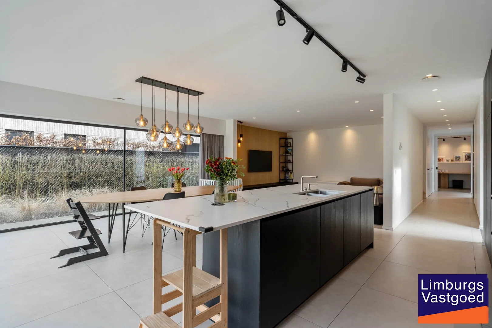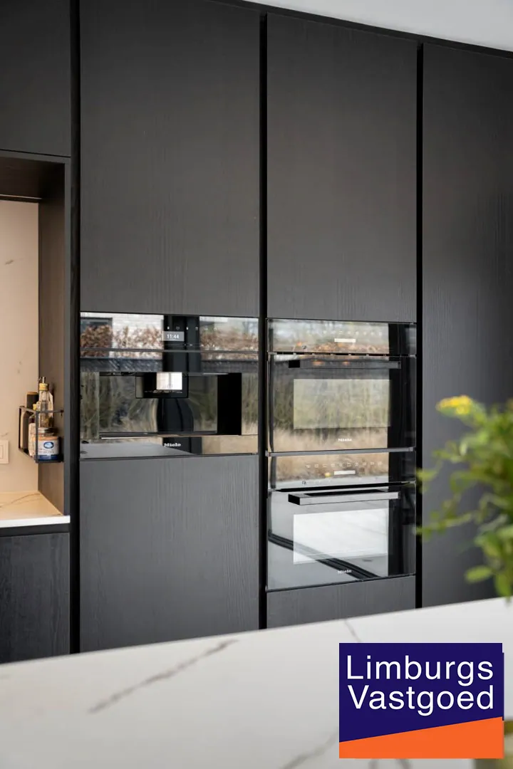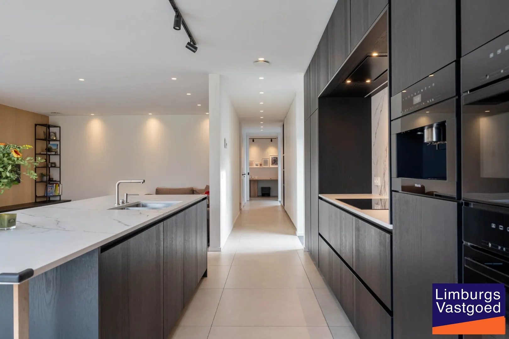GELIJKVLOERS: inkomhal voorzien van inbouwkasten en apart toilet, hoogwaardig afgewerkte keuken voorzien van dekton werkblad, 2 combi-ovens, ingebouwde koffiezet, driegats kraan, inductie vuur, vaatwasser (allen Miele toestellen); Lichtrijke leefruimte en zithoek dewelke via een schuifpui toegang verleent tot het terras en de volledig omheinde tuin; Bureauruimte;