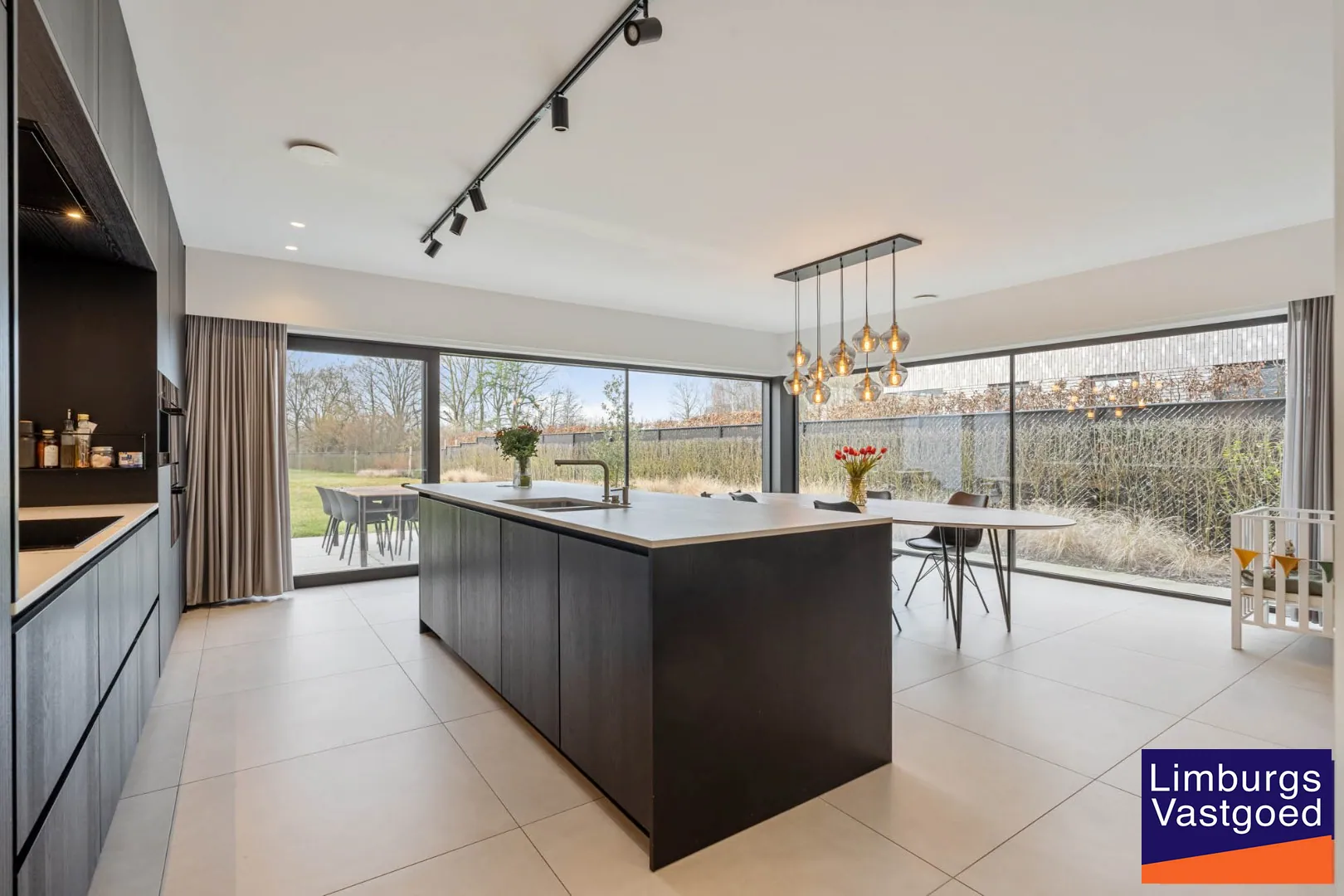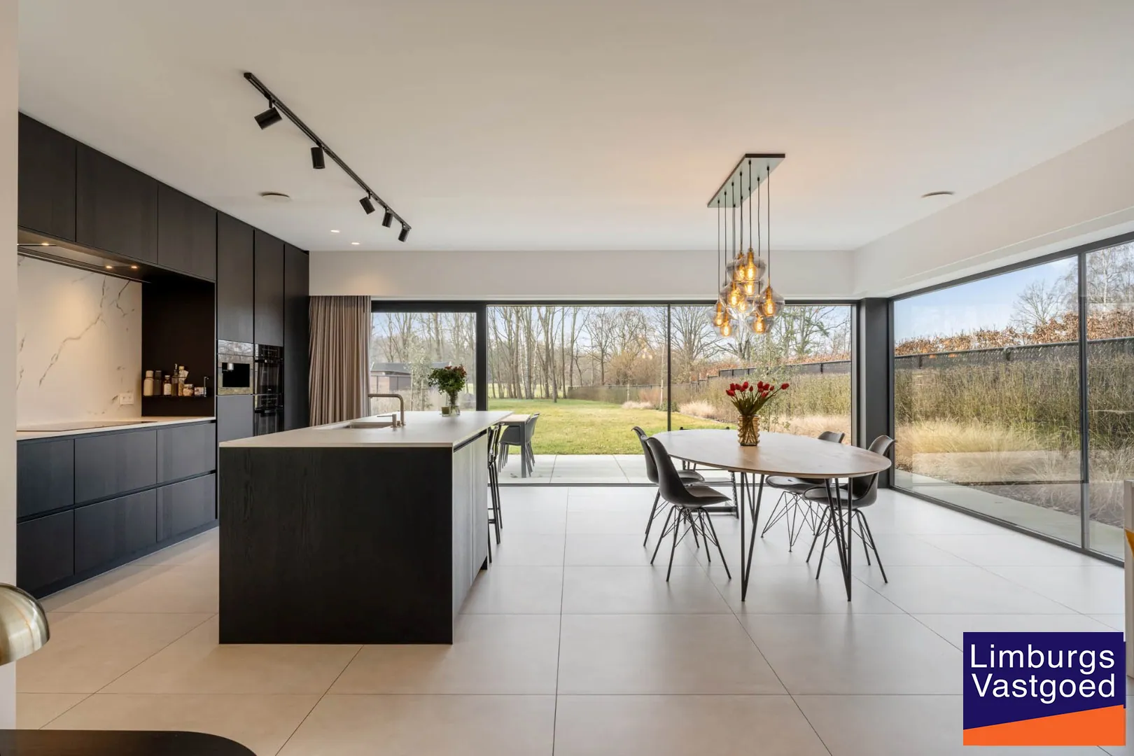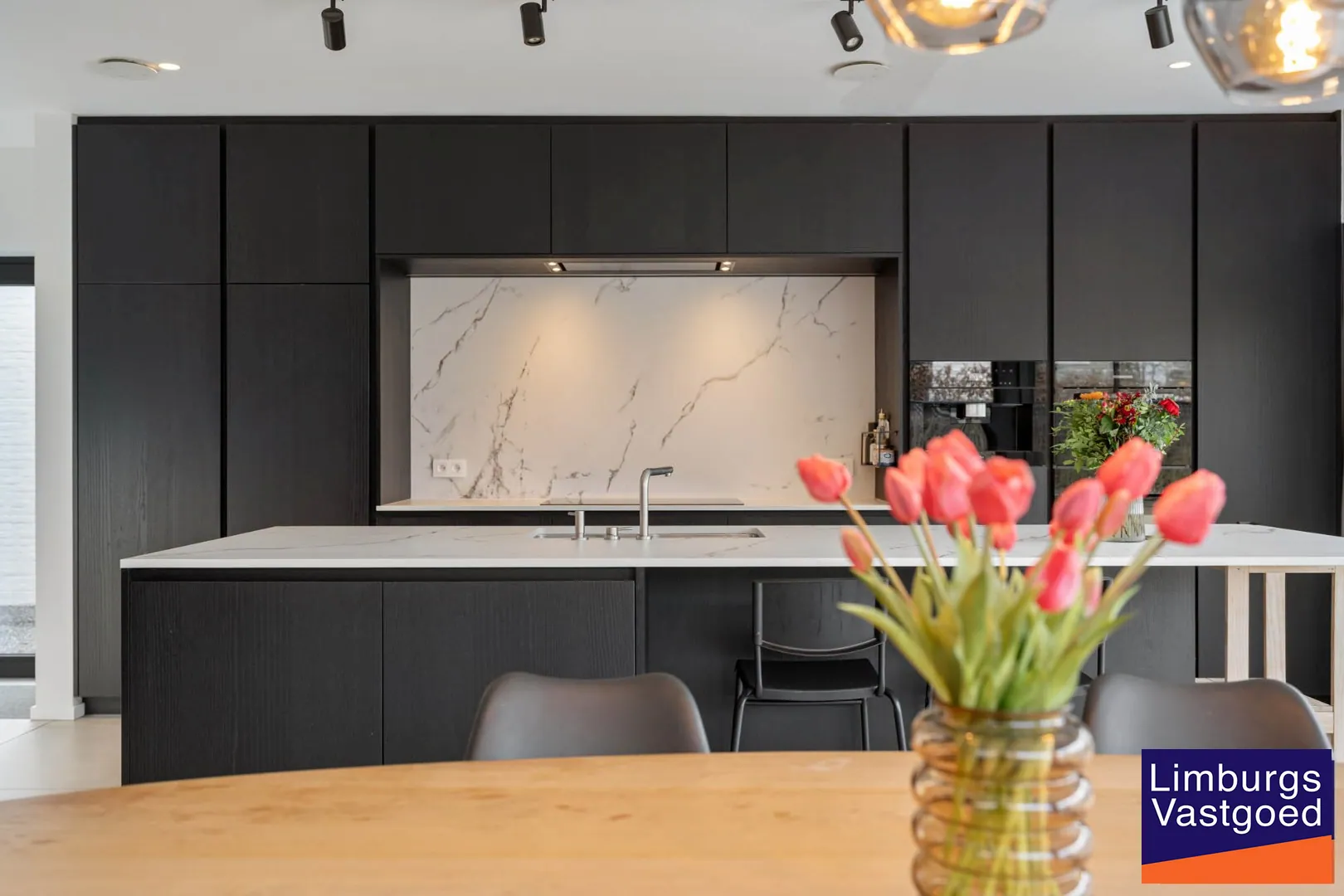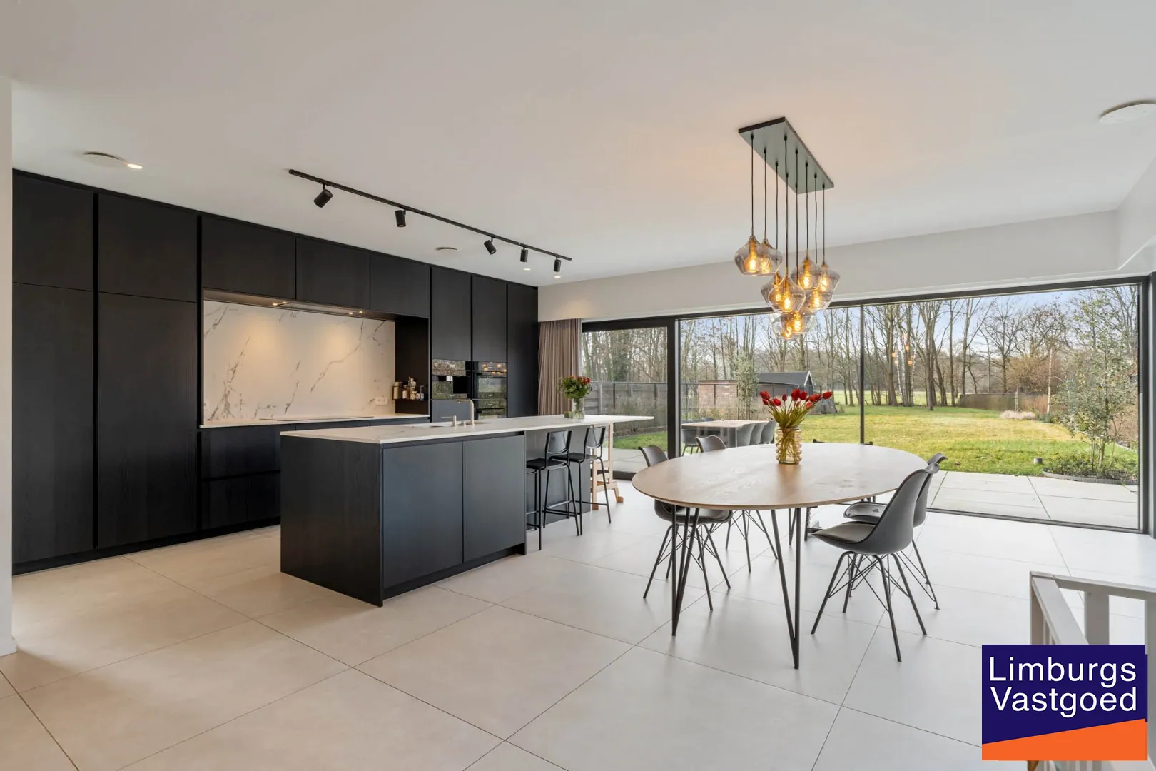 GELIJKVLOERS: inkomhal voorzien van inbouwkasten en apart toilet, hoogwaardig afgewerkte keuken voorzien van dekton werkblad, 2 combi-ovens, ingebouwde koffiezet, driegats kraan, inductie vuur, vaatwasser (allen Miele toestellen); Lichtrijke leefruimte en zithoek dewelke via een schuifpui toegang verleent tot het terras en de volledig omheinde tuin; Bureauruimte;